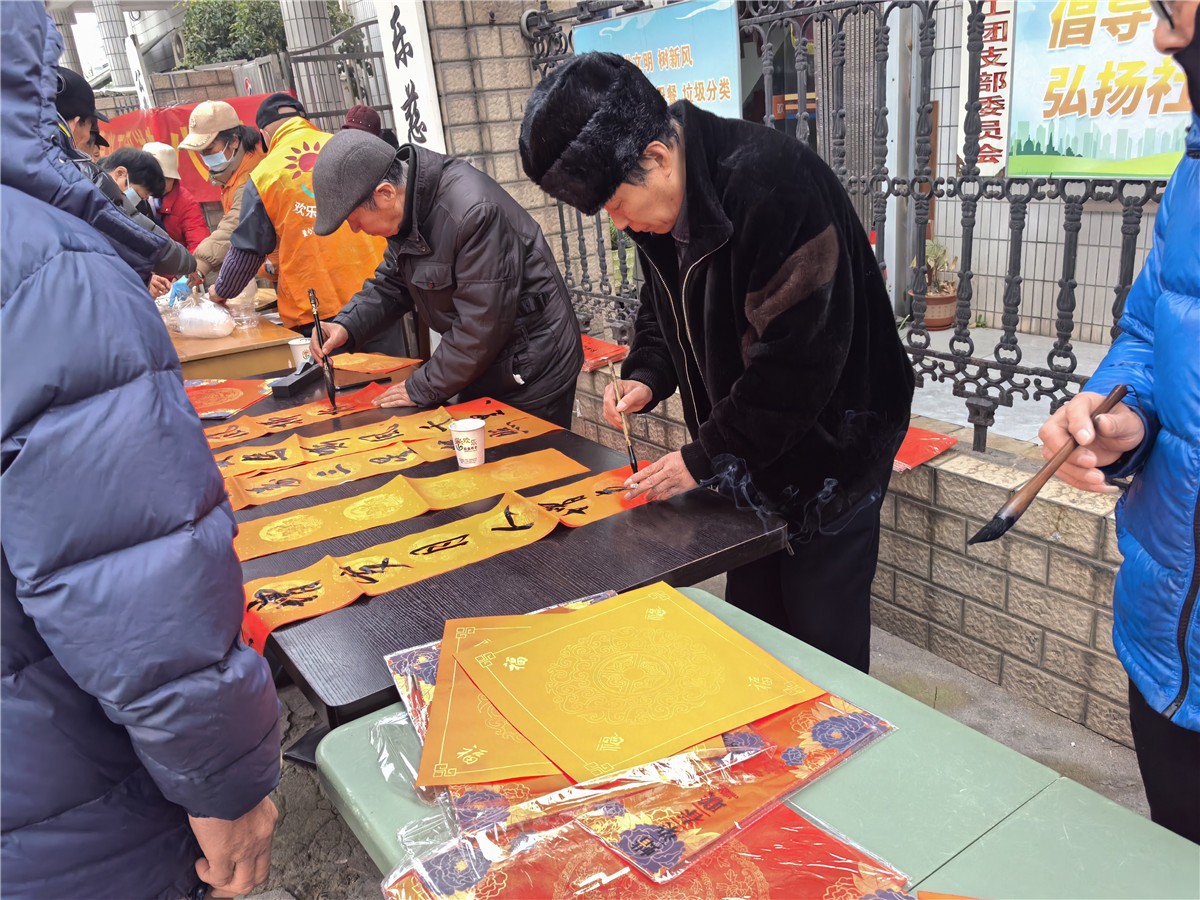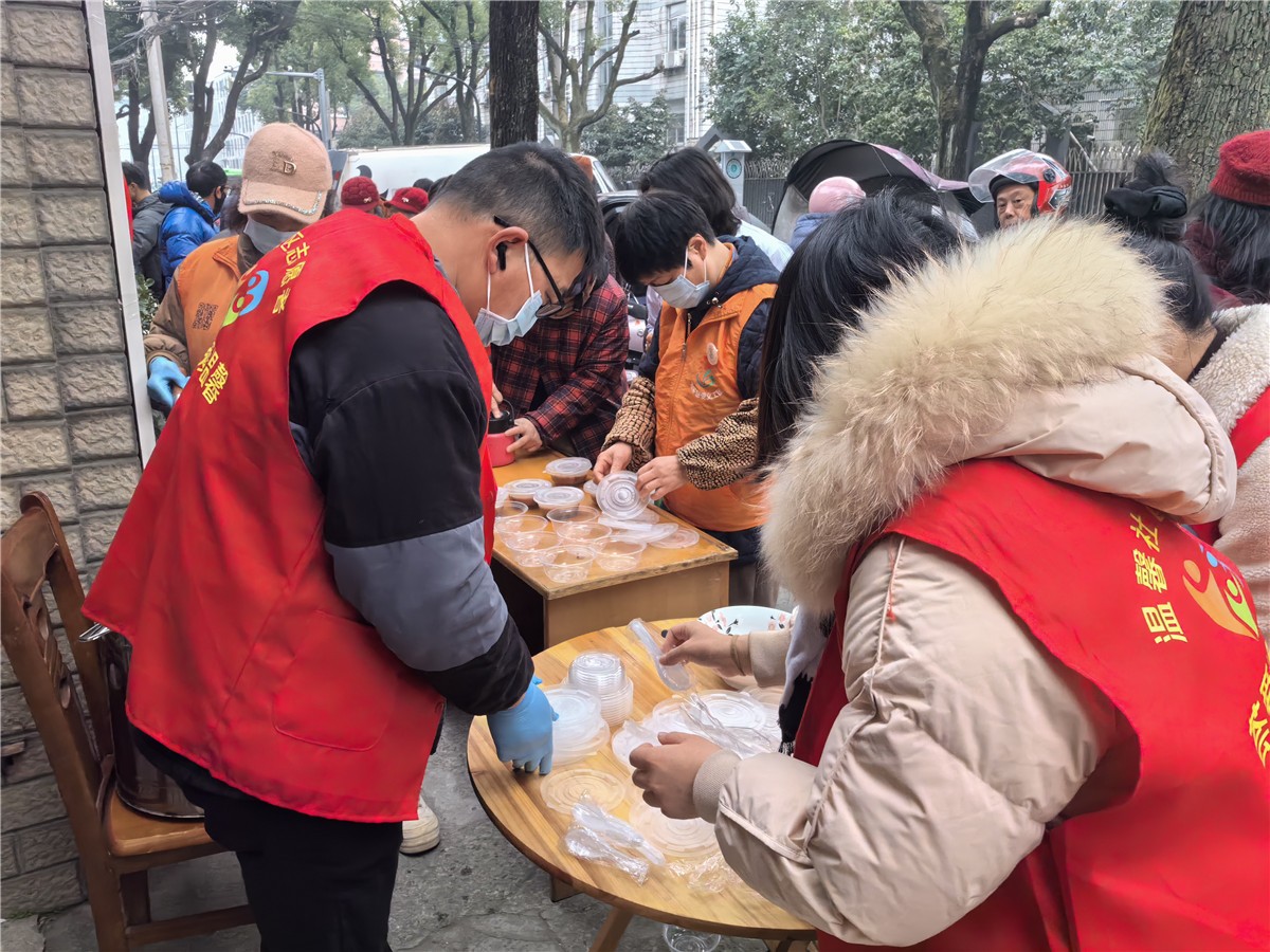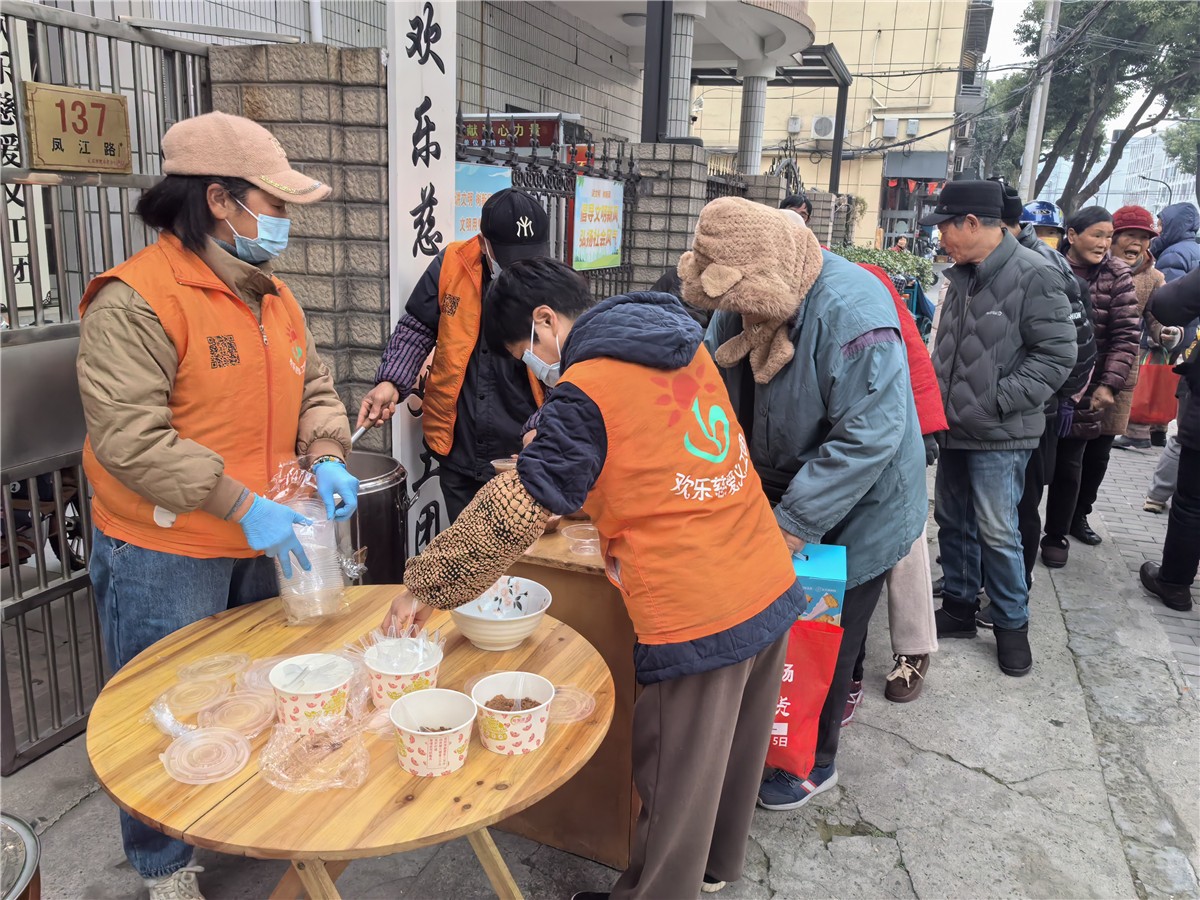 欢乐慈爱义工团呼应联动中国志愿浙江,分别在市区和柯桥区稽东,分别发放腊八粥和书写春联的站点。